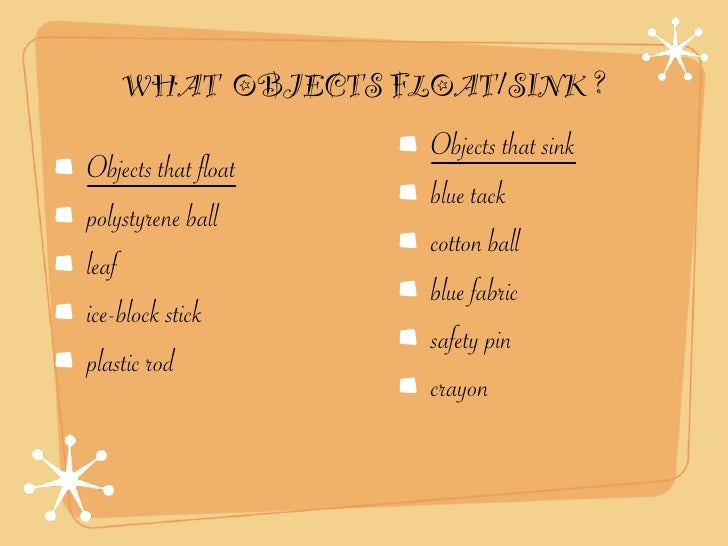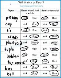 Floatable Objects Experiment. Sink or Float? You probably already know that some things will float in water and some will not. Make a prediction about each object - do you think it will sink or float in the tub of water? (To make a prediction means to say what you think will happen.) Sink or Float? This resource is only available to logged in users. Make a prediction about whether an object will sink or float Record observations of objects sinking or floating into a graph Whether an object will sink or float in a given liquid depends on the